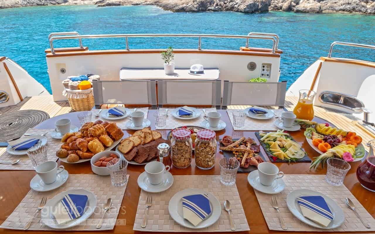 Start the day on the sundeck with a coffee and croissant, then get energized with freshly squeezed breakfast juice before a refreshing and invigorating morning swim. Alternatively, a delectable breakfast awaits you on the main deck. With the Guletbookers guarantee, you can be sure that your breakfast will only meet the highest quality and service standards, with a view of the bays and islands that are undeniably celestial in every corner.