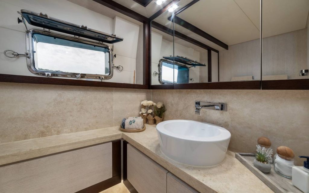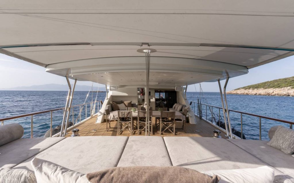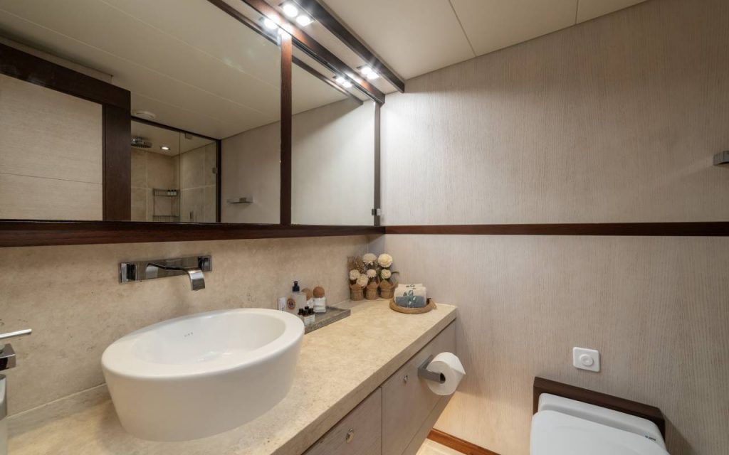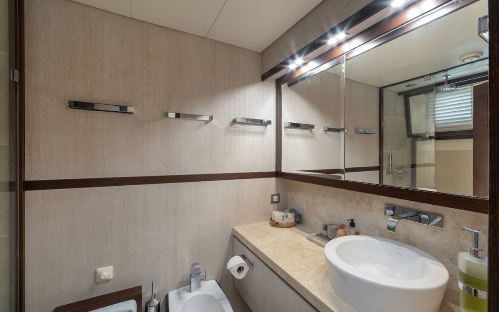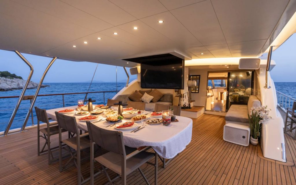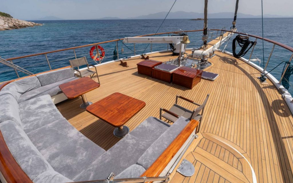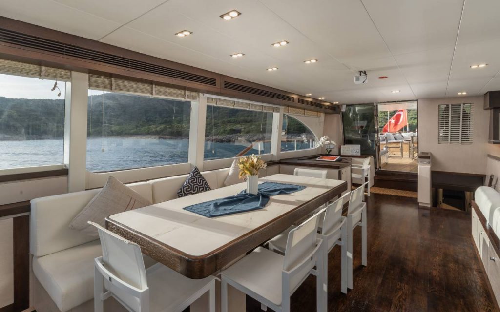 The spacious saloon includes air conditioning and TV for relaxation, while the onboard music system creates a pleasant atmosphere throughout your blue cruise. Stay connected with available internet access during your private yacht charter.