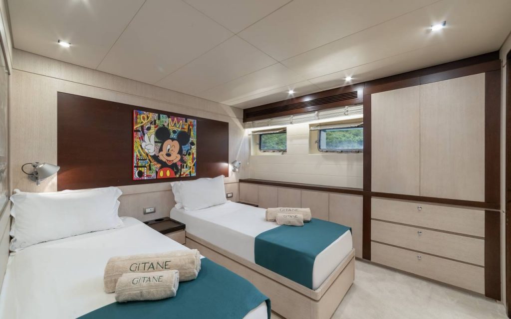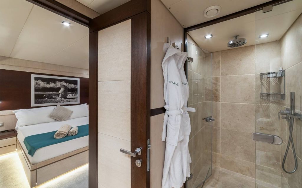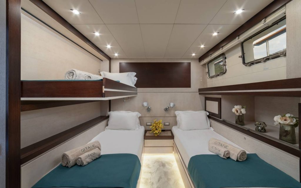 Gitane is a 37-meter gulet based in Bodrum, offering comfortable accommodation for up to 9 guests in Turkey. The yacht features 4 well-appointed cabins including 2 double cabins, 1 twin cabin, and 1 triple cabin, all equipped with air conditioning and en-suite bathrooms with shower boxes.