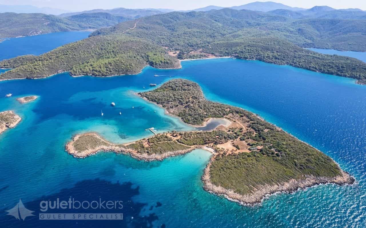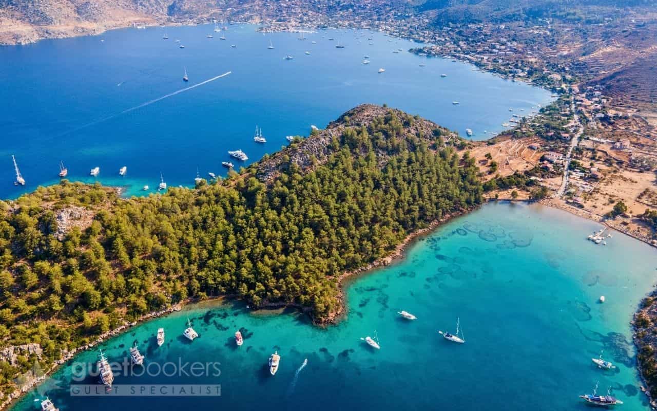 True to its name (“Cennet” means paradise in Turkish), this bay features crystal-clear waters in varying shades of blue and turquoise. Protected from winds by surrounding hills covered with olive trees and pines, it’s an ideal spot for afternoon swimming and sunset cocktails on deck.