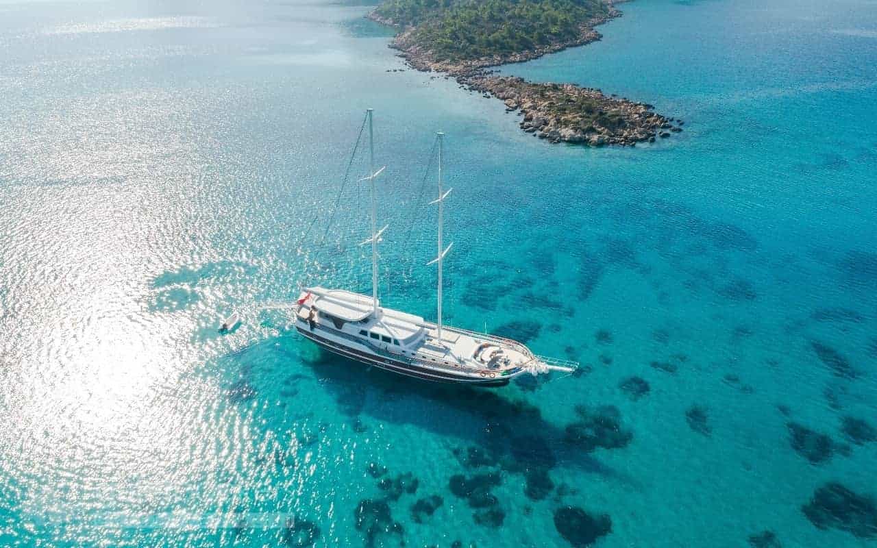 is a luxury gulet with the crew. She has a 29 meters length and 7 meters beam. She can accept up to 12 guests in 6 comfortable cabins. There are 2 masters, 2 double and 2 twin bed cabins. Each cabin has an en-suite bathroom and well decorated. Koray Ege offers some watersports such as waterski, Ringo, canoe also provides basic fishing equipment and snorkel gears for diving. She was built in 2018 and the embarkation port of the yacht is Bozburun, Marmaris, or Fethiye. Charter prices of the Koray Ege are between 1.250 € – 2.125 € in the summer season.