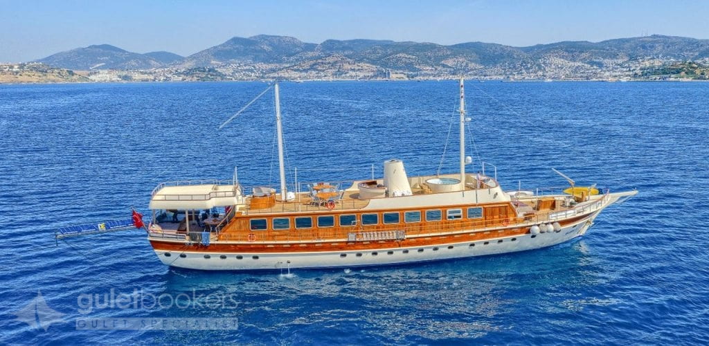 The twelve cabin yacht ELARA 1 ( formerly named Halis Temel gulet ) is one of the larger motorsailers to offer Deluxe gulet holidays along the Turkish coast and into the Greek Islands for large groups and families, or corporate meeting and incentive groups, of up to twenty-four guests. Within her attractive and classic gulet hull, there are all the modern comforts of comfortable. Beds, well-appointed bathrooms for each cabin, air conditioning. Indoor dining and relaxation areas with entertainment systems, and copious outdoor deck space for dining, sunbathing and relaxing.
