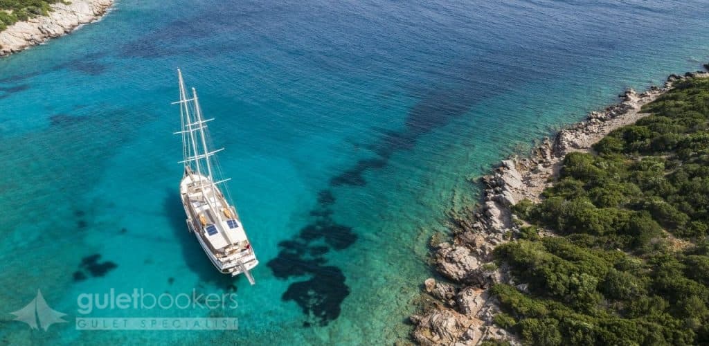 Today, Gulets, varying in size from 14 to 35 meters, is popular for tourist charters. Gulets born in Bodrum and continue her life on the best bays of the Aegean Sea. Especially the Bodrum coastline is calm and has various bays to stop and relax. Gulet is gliding, with summer sunshine and compatible choppy water to the aqua blue pure clean endless sea.